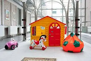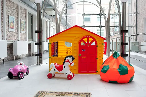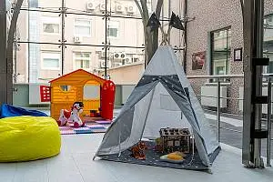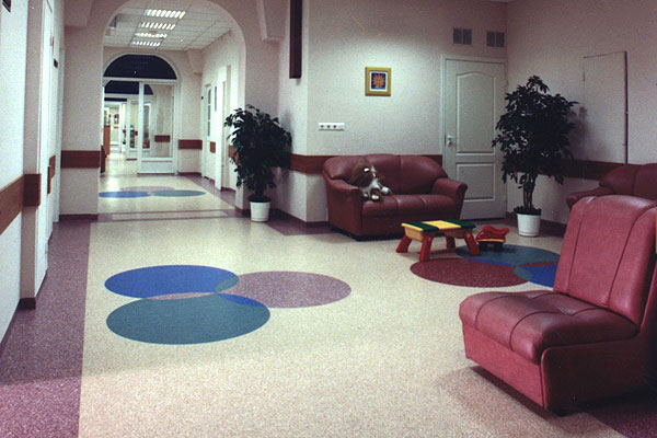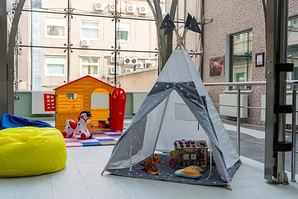 Пребывание ребенка в лечебном учреждении само по себе является стрессовой ситуацией, особенно при необходимости находиться в нем круглосуточно. Чтобы снизить стресс у маленького пациента, особенно если ребенок младшего возраста, мы стараемся отвлечь его внимание. При поступлении ребенка в стационар стараемся предложить ему что-то новое и интересное: мягкую игрушку с медицинскими атрибутами, тематическую книжку «Путешествие маленького Анатолия». Это позволяет нам наладить доверительный контакт с ребенком с первых минут его пребывания в клинике. По телевизору в палате транслируется подборка мультфильмов и детских передач. Кроме того, в детском атриуме в стационаре имеется специализированная комфортная игровая зона. В условиях стресса многие дети испытывают необходимость спрятаться, поэтому в детской игровой зоне стационара имеется детский домик и вигвам с мягкими игрушками, мягкие кубики с буквами, игрушечный компьютер. Дети привыкли к тому, что врачи носят белый халат, и у многих из них формируется устойчивая ассоциативная связь «белый халат — врач — боль». Наши медицинские работники носят формы различных расцветок и шапочки с веселым рисунком, что у ребенка снимает ассоциацию, связанную с болью.