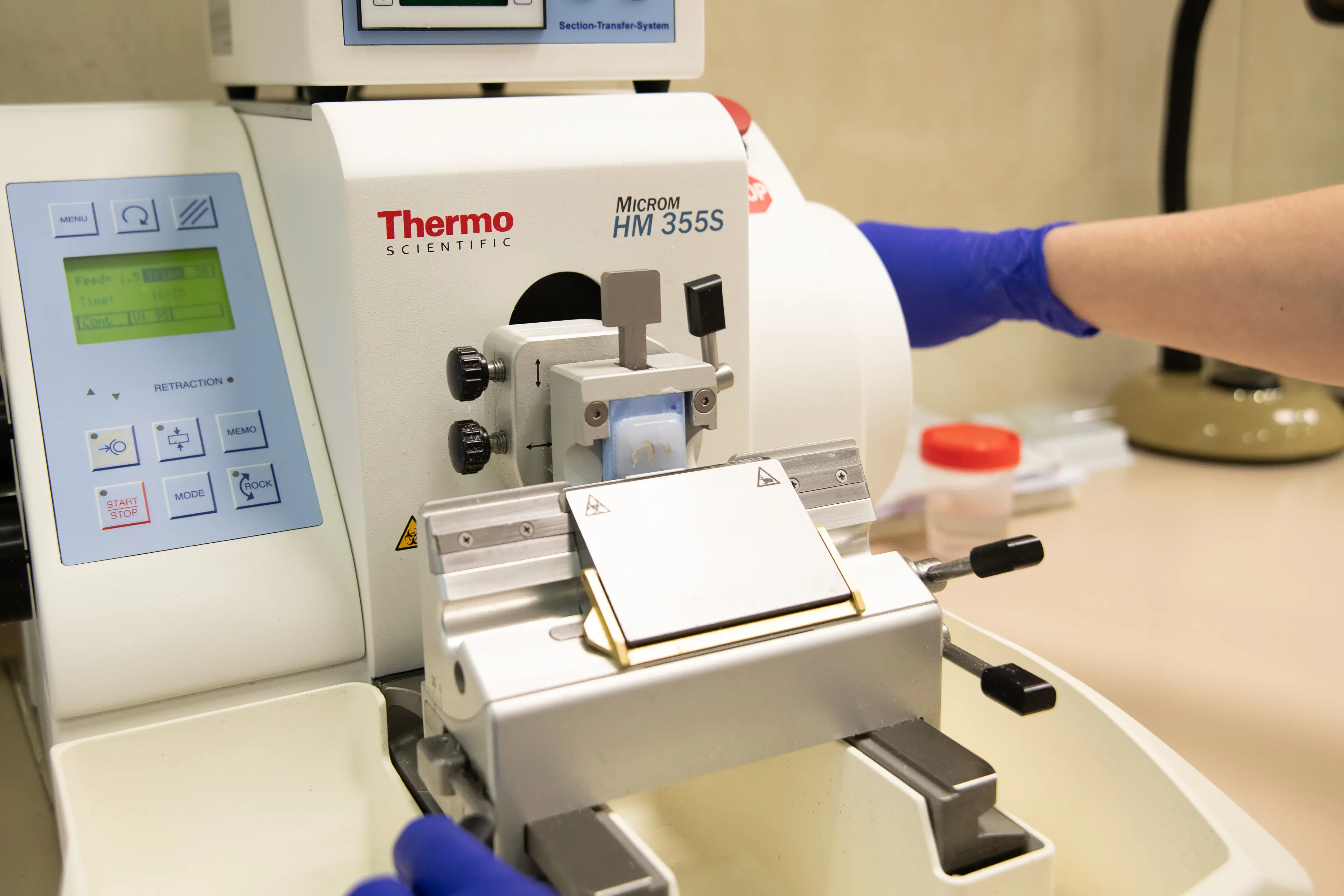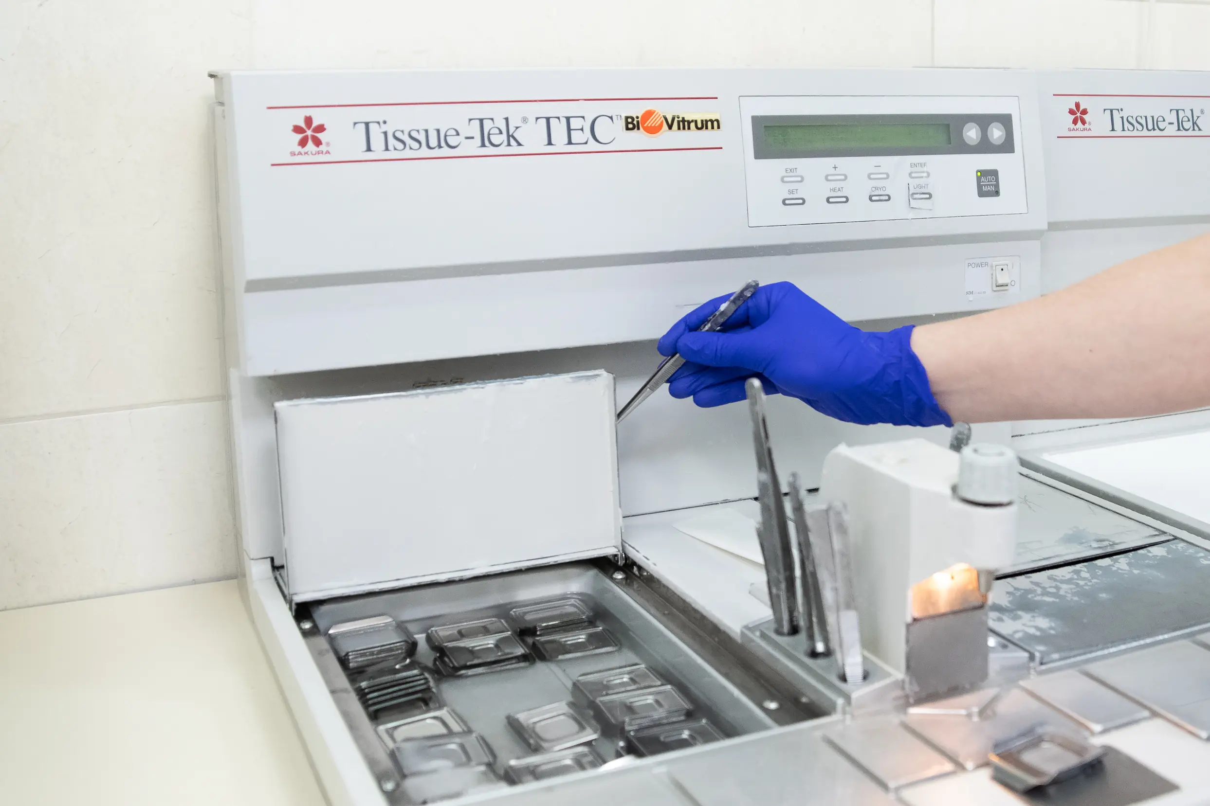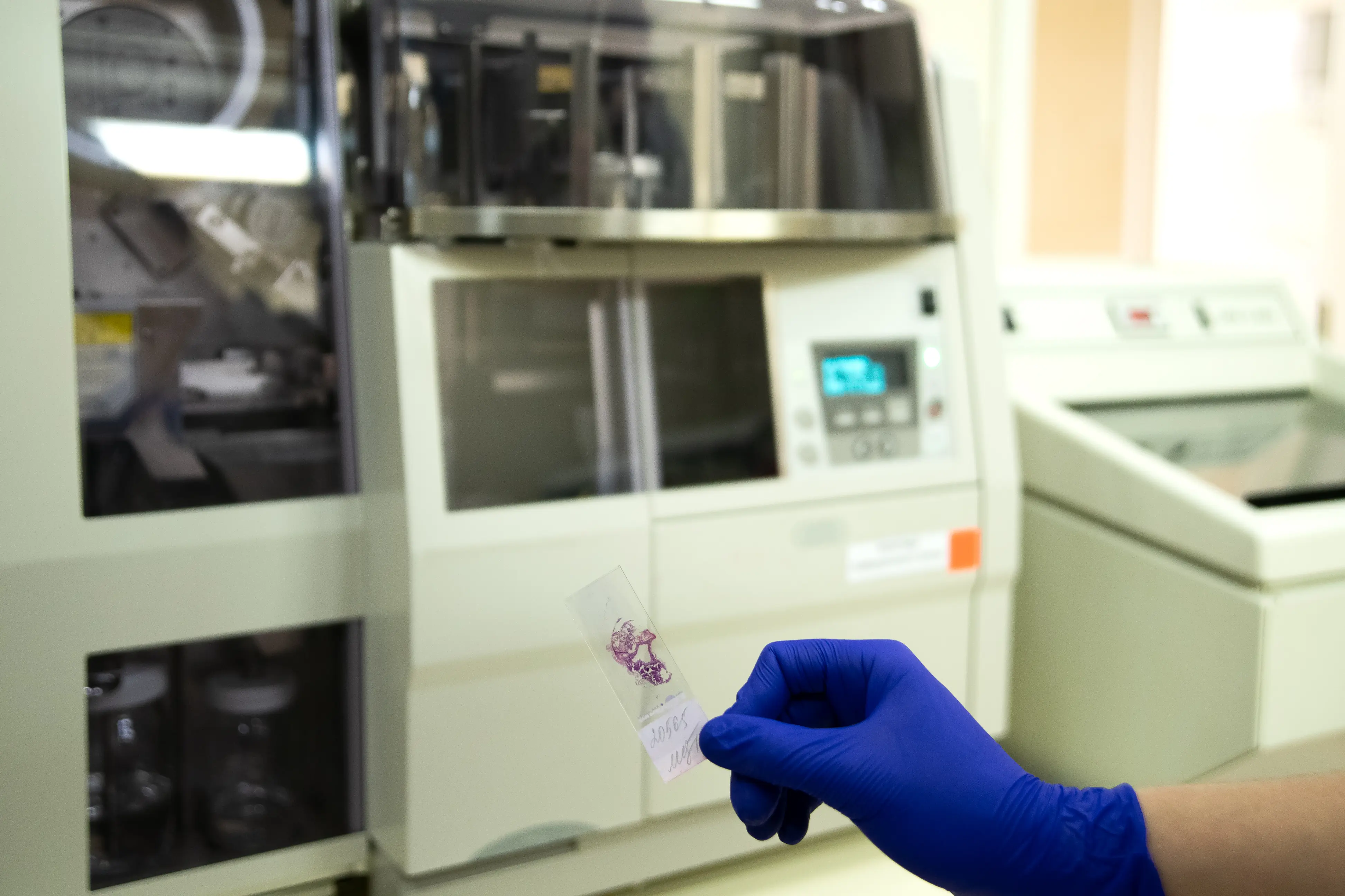 После доставки биоматериала в лабораторию его размещают в специальных гистологических кассетах. Далее выполняется обезвоживание материала, заливка формалином, пропитывание парафином (в таком виде образец можно хранить продолжительное время при +10…+25 °С при отсутствии доступа солнца. Для непосредственного исследования на парафиновом блоке делается тонкий срез до 4-5 мкм, который помещается на гистологическое стекло и окрашивается (гематоксилин, эозин), поэтому ткань приобретает оттенки от розового до фиолетового. Окрашенный образец ткани, с двух сторон покрытый стеклами, обычно называют «гистологическое стекло». После изучения биоматериала врач-патоморфолог выдаёт заключение с параметрами тканей.
