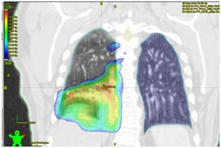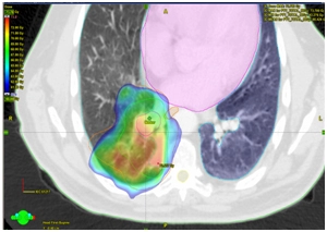 18.01.2017 – 03.03.2017. Радикальный курс лучевой терапии на первичный очаг в правом легком и зоны регионарного лимфоотока (ПЭТ – позитивные лимфоузлы средостения) в разовой дозе 2Гр до суммарной дозы 66 Гр за 33 фракции. Продолжительность лечения 6 недель. Выполнено 6 введений Паклитаксел 50 мг/м2 + Карбоплатин 2 AUC еженедельно.