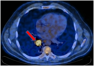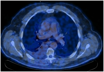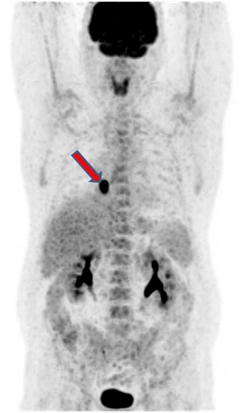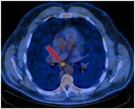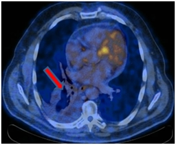 ПЭТ/КТ от 31.05.2017. Отмечается положительная динамика в виде нивелирования центрально расположенного образования нижней доли правого легкого и медиастинального лимфоузла. Постлучевой фиброз, ателектаз нижней доли правого легкого. Умеренно выраженный правосторонний гидроторакс. Повышение метаболизма в кардиальном отделе пищевода – постлучевой воспалительный процесс.