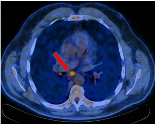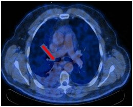 ПЭТ-КТ от 12.01.2017. В правом легком определяется мягкотканое образование метаболическим размером 30×24 мм с кальцинатом в структуре SUVmax=21,36, перекрывающий просвет промежуточного бронха справа сразу за уровнем ответвления среднедолевого бронха с формированием картины «культи бронха» – в бифуркационном лимфатическом узле до 20 мм SUVmax=4,77.