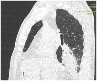 КТ ОГК от 28.03.2017. По сравнению с предыдущим КТ от 06.01.2017 отмечается выраженная положительная динамика изменений за счет отсутствия образования в просвете промежуточного и нижнедолевого бронхов справа, отсутствия ателектаза нижней доли, а также умеренного уменьшения в количестве и размерах лимфатических узлов средостения и корня правого легкого.