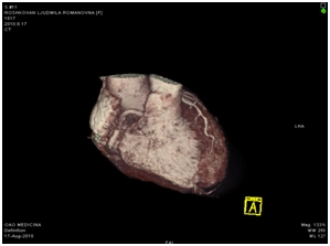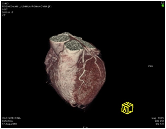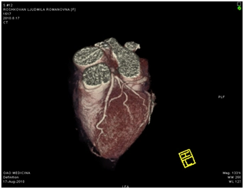 Ствол ЛКА широкий, имеет ровные контуры, не стенозирован. ПНА в проксимальном сегмента имеет неровные контуры за счет кальцинированных и частично кальцинированных бляшек, просвет артерии на этом уровне сужен до 30-50%, в среднем сегменте определяется ряд пристеночных и циркулярных мягких бляшек, со стенозом артерии до 60-75%, дистальные отделы артерии малого калибра, плохо заполняются контрастным веществом. ОА нормального диаметра, заполняется контрастным веществом без признаков гемодинамически значимого стеноза. ПКА нормального диаметра, в проксимальном сегменте имеются смешанные частично кальцинированные бляшки, стенозирующие просвет до 30%, в среднем сегменте визуализируется пристеночная смешанная бляшка, стенозирующая просвет до 50-70%, дистальный сегмент не изменен. Правый тип коронарного кровоснабжения.