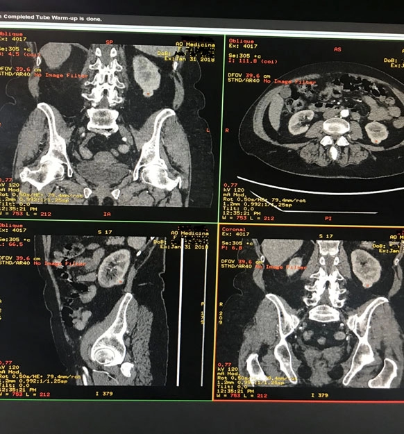 2. Диагностика. Заболевание (примерно в 40% случаев) выявляется случайно, при диспансерном обследовании. В момент, когда появляются первые симптомы, можно говорить уже о запущенной стадии. Наиболее доступный метод выявления образований почек – ультразвуковое исследование, которое рекомендуется проходить не менее 1 раза в год. Для подтверждения диагноза, заподозренного при УЗИ, применяется компьютерная томография почек с контрастированием (золотой стандарт обследования почек). К сожалению, на момент первичной диагностики у 30% пациентов могут быть выявлены отдаленные метастазы. В случае спорных данных, полученных при МСКТ, дополнительную информацию для принятия решения о методе лечения и наблюдения позволяет получить магнитно-резонансная томография почек.
