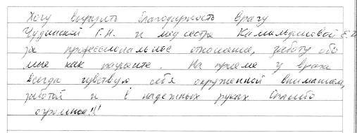 Хочу выразить огромную благодарность Чудинской Г. Н. за своевременную помощь, очень профессиональна, совет как спать, как встать без одышки вообще, и особенно при больном позвоночнике. Иду каждый раз получить советы и назначения, облегчающие боль.
