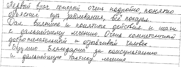 Честно не ожидал, за 15 минут разобрал мне мою болезнь, что мне за три месяца другие не объяснили, без воды, на все вопросы - конкретные ответы, обращался за вторым мнением, что хотел, получил сполна. Спасибо, надеюсь если продолжу лечение в этой клинике не буду разочарован , и первое мнение не будет испорчено.