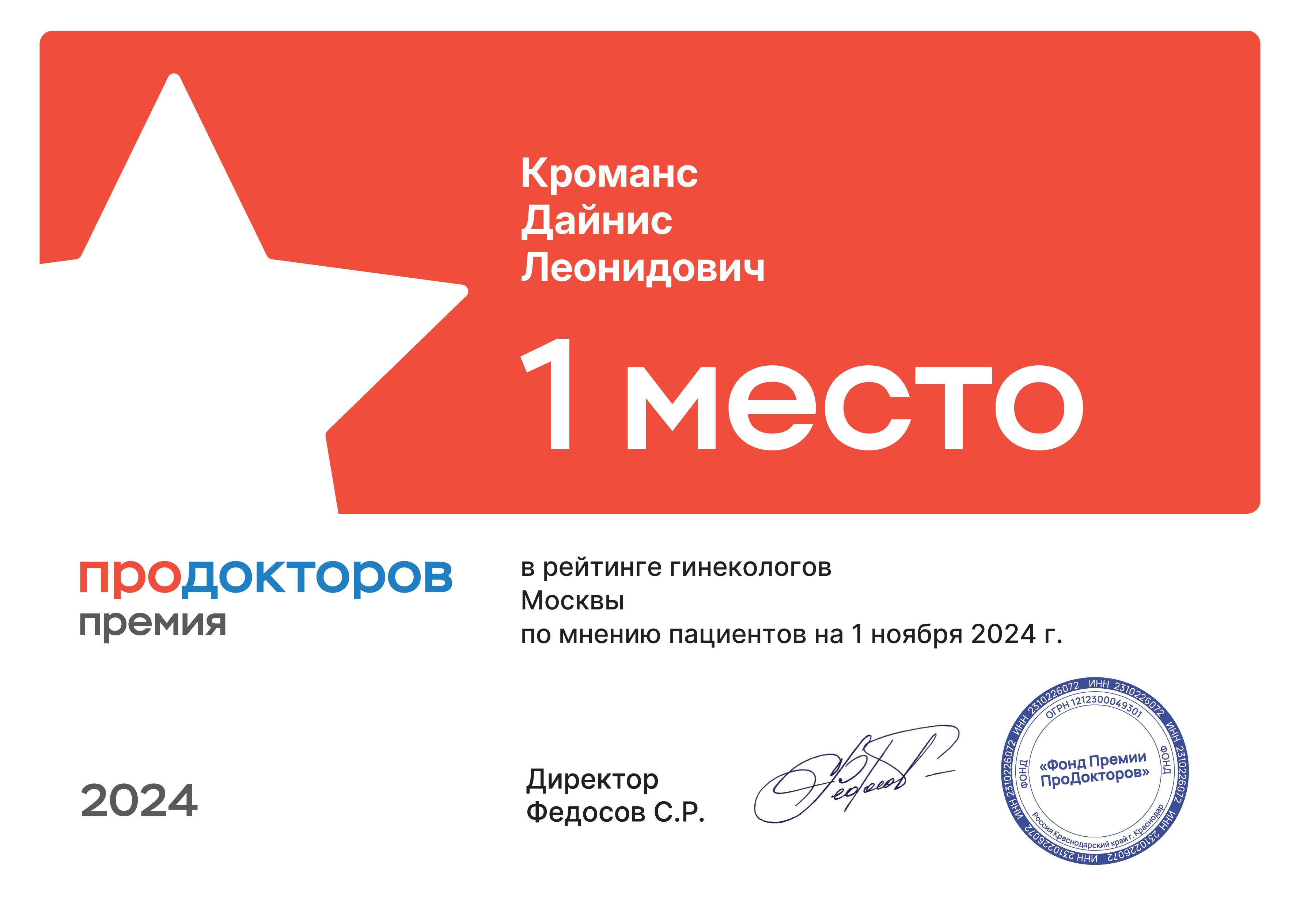 Хочу выразить огромную благодарность доктору Гинеколог-Хирург -Кромансу Дайнису Леонидовичу…