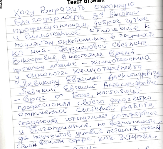 Хочу выразить свою благодарность доктору-онкологу Левикину Е. А. и медсестре Лидии. Это…