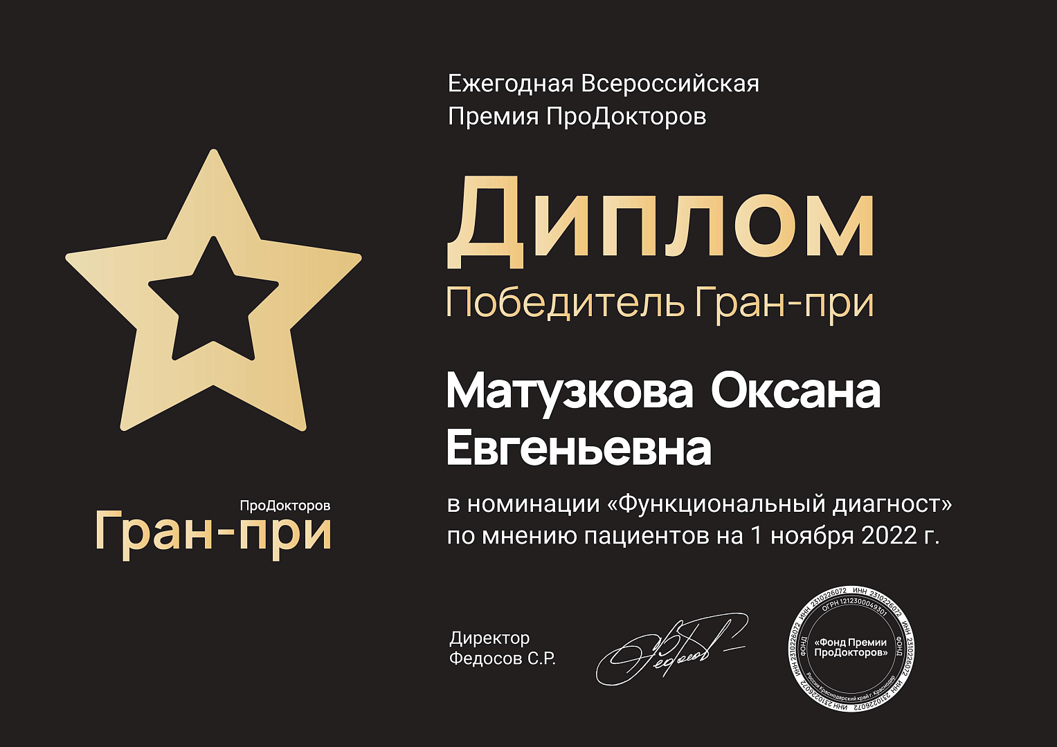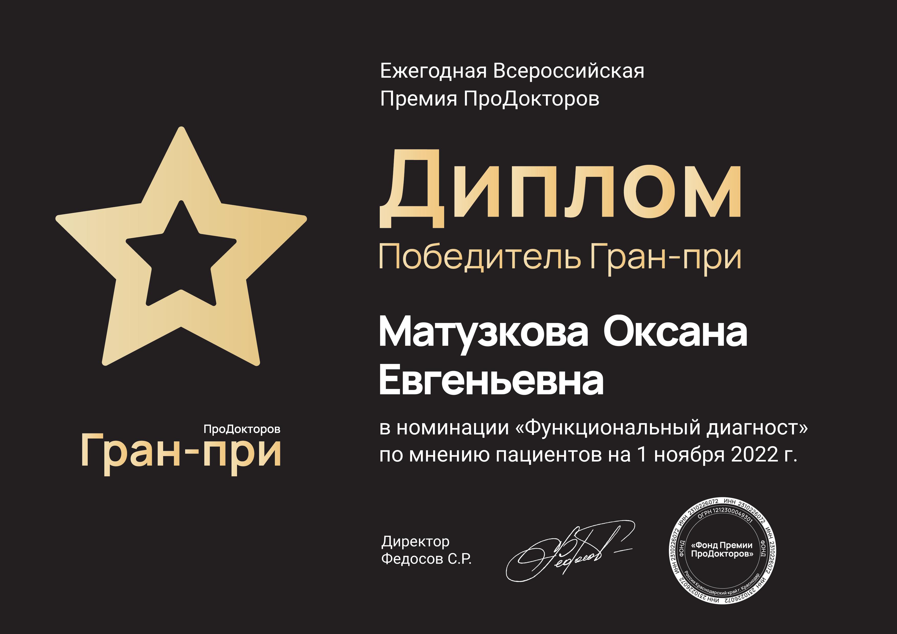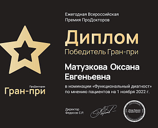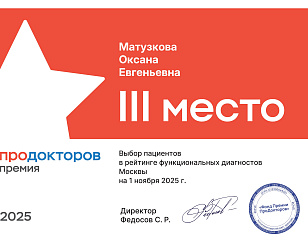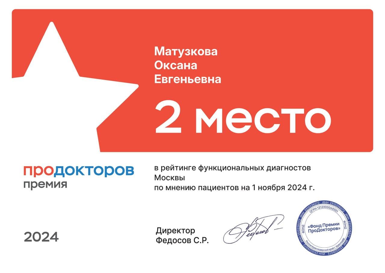 В 2022г заняла 1 место в рейтинге функциональных диагностов Москвы по мнению пациентов, премия ПРОДОКТОРОВ.
