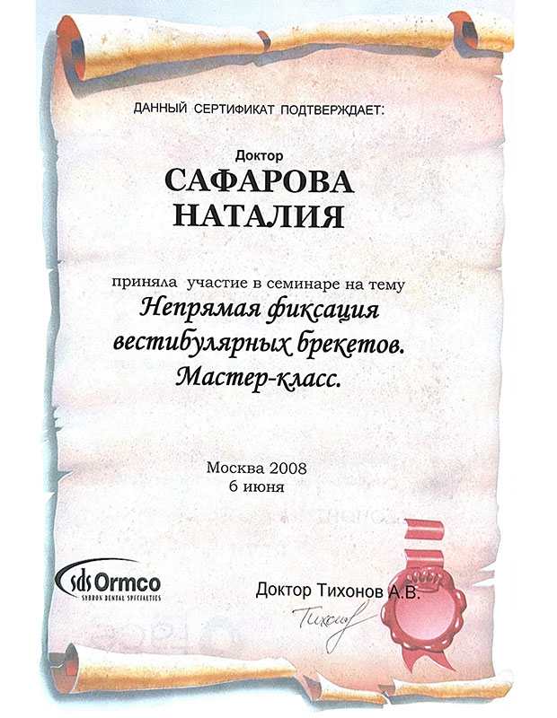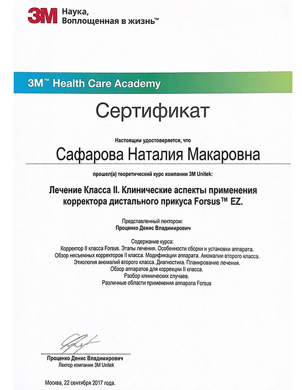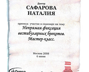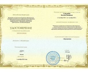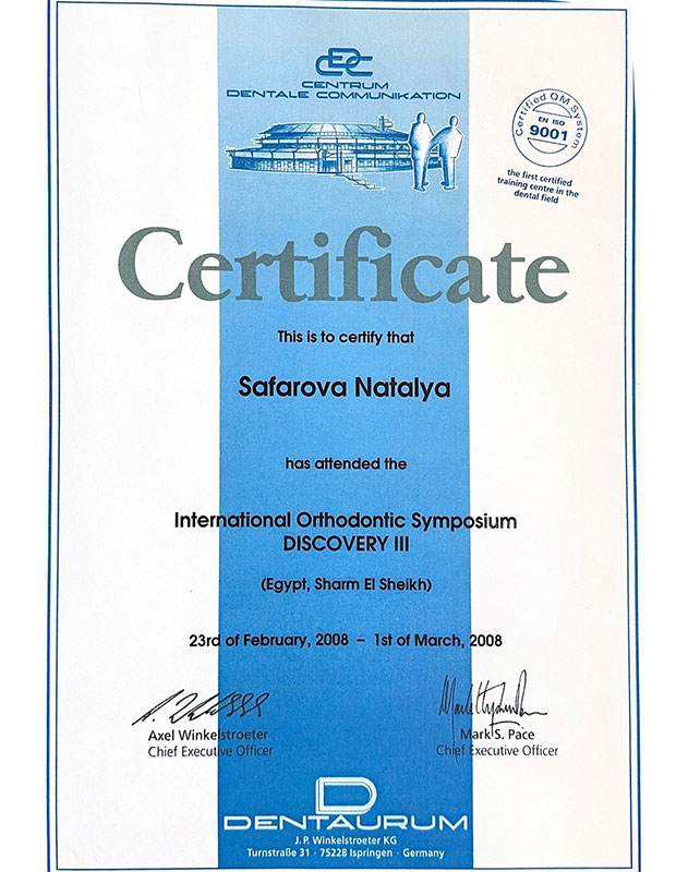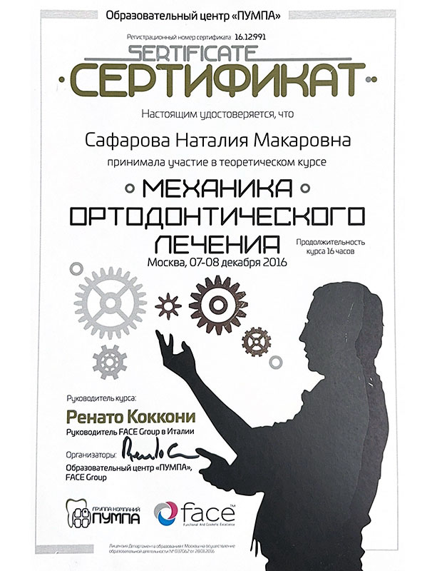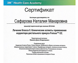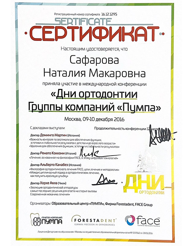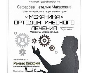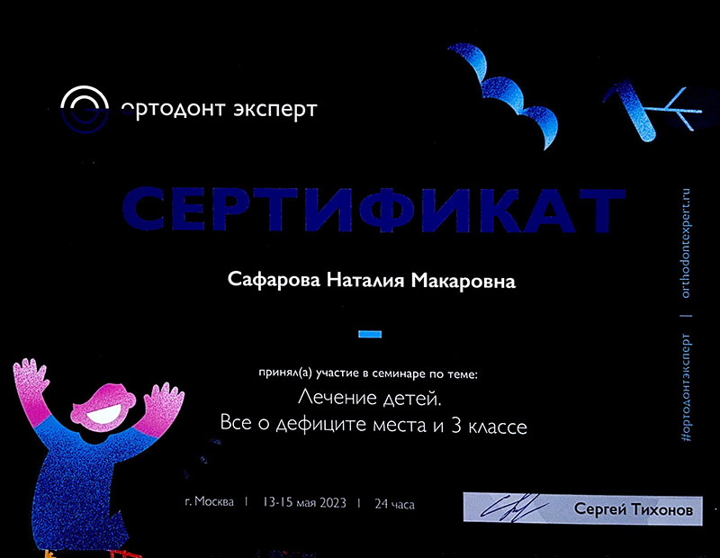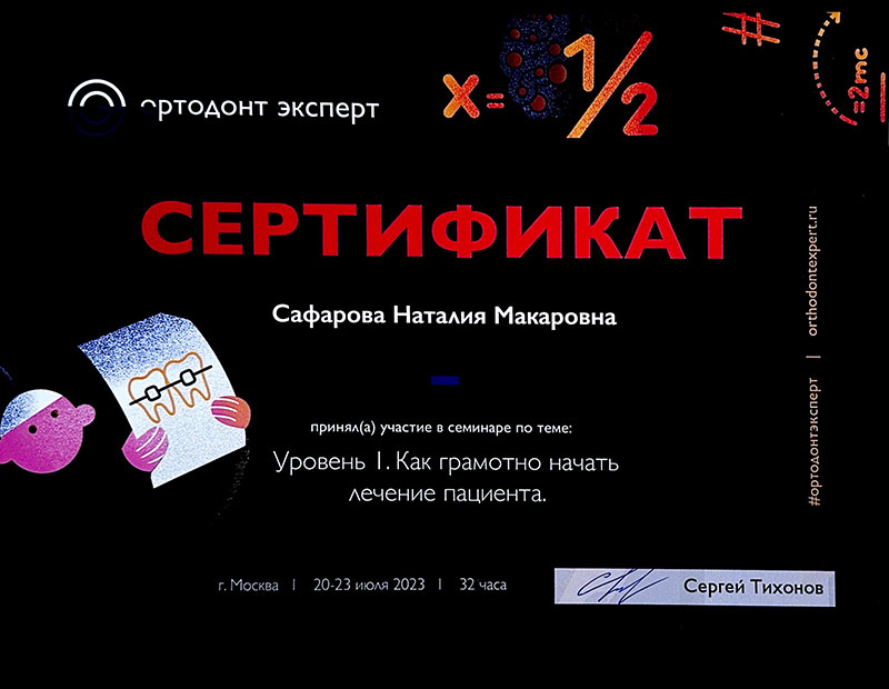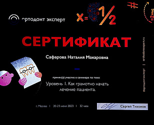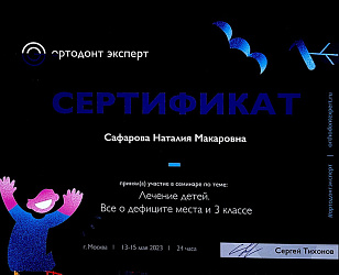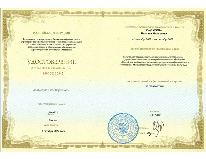 2022 г. – удостоверение о прохождении курса повышения квалификации по ортодонтии РМАНПО МЗ РФ