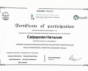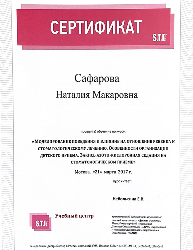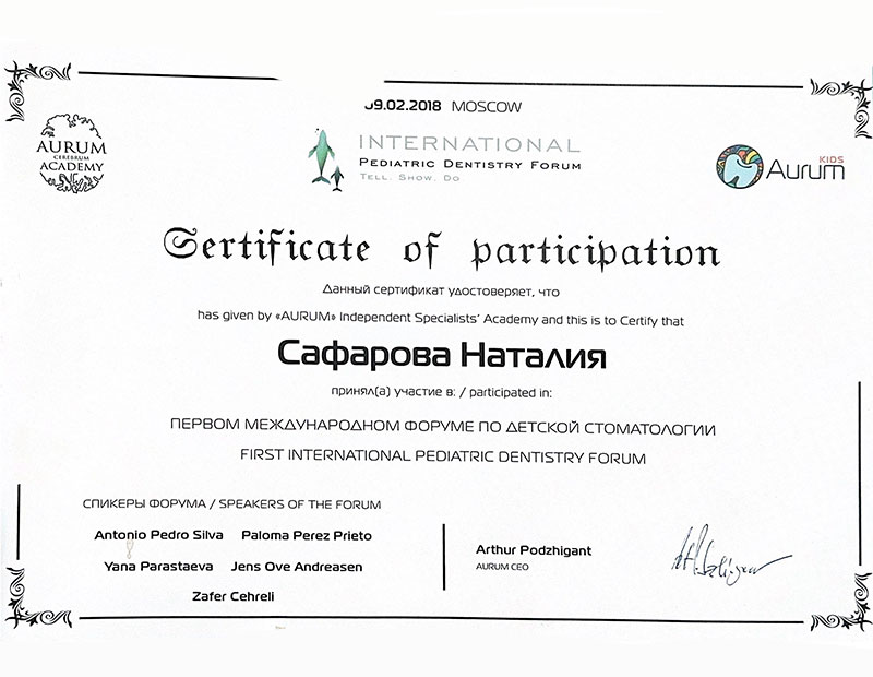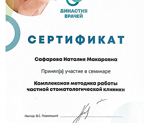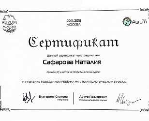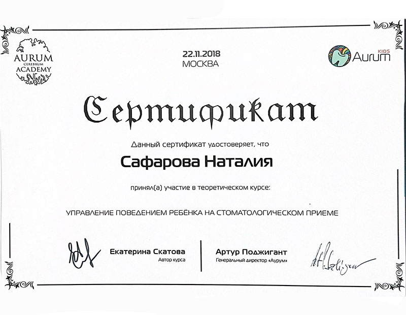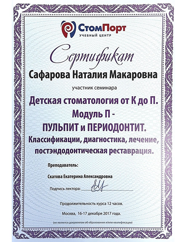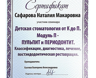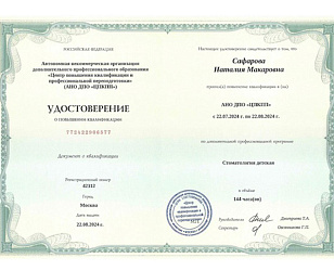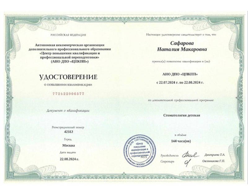 2024г. – удостоверение о прохождении курса повышения квалификации по детской стоматологии