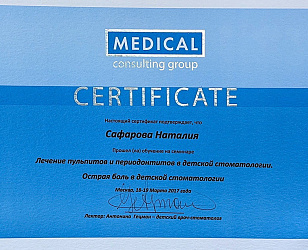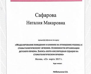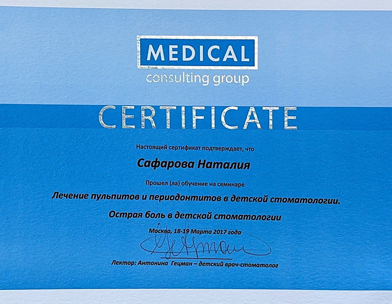 В 2014 году прошла профессиональную переподготовку по детской стоматологии в МГМСУ им Евдокимова