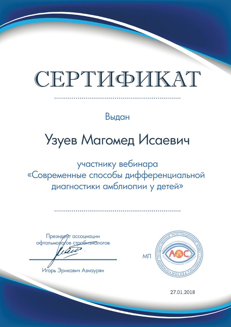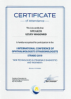 Владеет высокотехнологичными методами диагностики: ОКТ сетчатки и роговицы, кератотопографии, УЗИ глаза (В-скан), периметрия, исследование глазодвигательных функций, МРТ орбит, углубленная диагностика бинокулярных функций при косоглазии, исследование стерезрения и глубинного зрения, осмотр с линзой Гольдмана, офтальмоскопия всеми методиками.