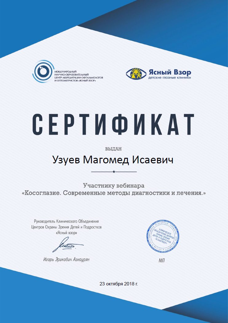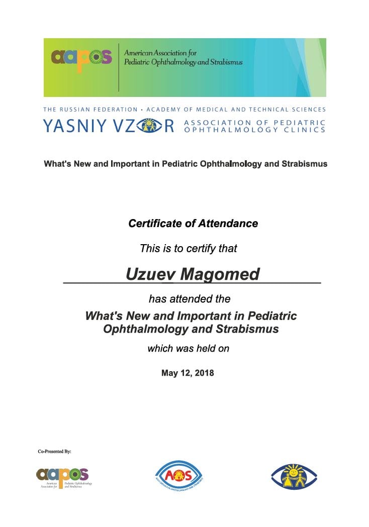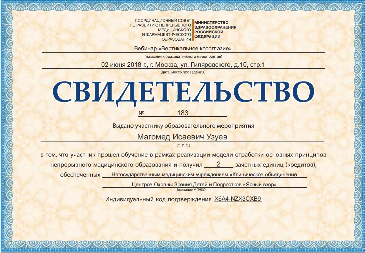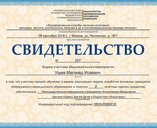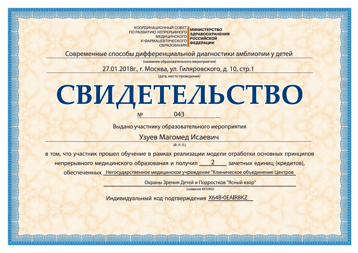 Прошел клиническую ординатуру на кафедре ГБОУ ВПО МГМСУ им. А.И. Евдокимова по специальности «Офтальмология» на базе ФГБУ «МНТК «Микрохирургия глаза» им. акад. С.Н. Федорова» (Москва)..