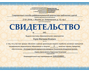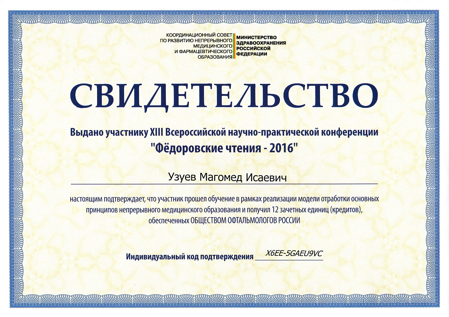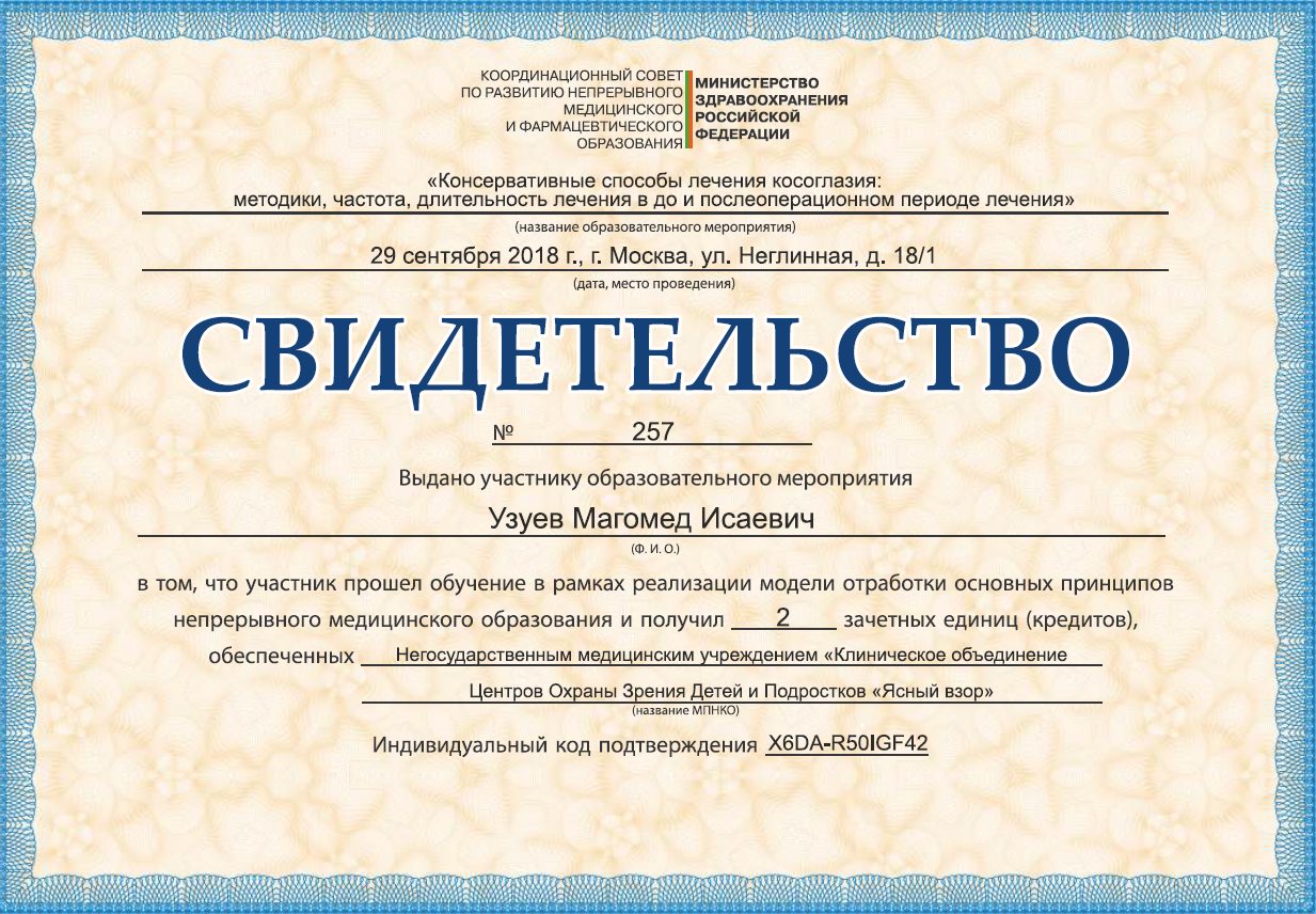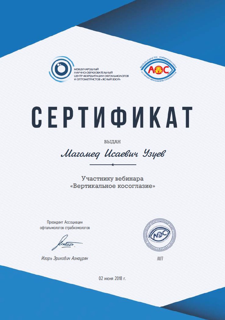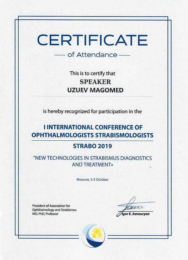 Прошел клиническую ординатуру на кафедре ГБОУ ВПО МГМСУ им. А.И. Евдокимова по специальности «Офтальмология» на базе ФГБУ «МНТК «Микрохирургия глаза» им. акад. С.Н. Федорова» (Москва)..