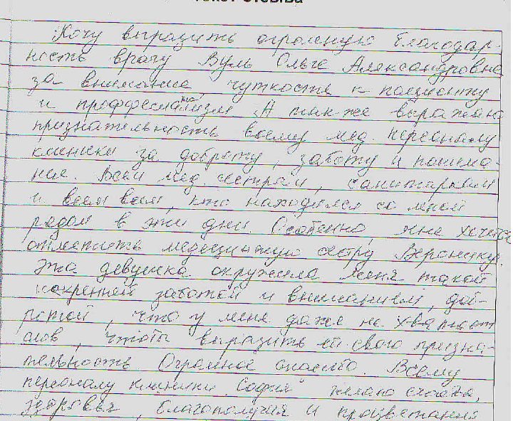 Огромное спасибо за внимательное отношение к пациенту, доброжелательную атмосферу, желание внимательно выслушать, ответить на все вопросы, поддержать морально, что особенно важно пациентам с таким заболеванием. Очень важно, что связь с лечащим врачом может осуществляться круглосуточно. Спасибо мед. персоналу за качественное, безболезненное проведение процедур. Особая благодарность врачу Вуль Ольге Александровне за ее профессионализм, уверенность в том, что все будет хорошо.