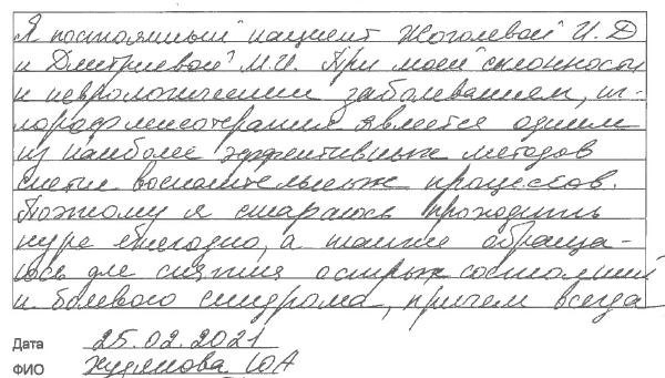 Закончила курс лечения и хочу выразить самую искреннюю благодарность Жоголевой И.Д., врачу-рефлексотерапевту, за её высочайший профессионализм, высокую компетентность в медицине. Она – наилучший пример для всех врачей. Доктор должен быть именно таким: внимательным, чутким, доброжелательным, дающим нужные рекомендации и ответы на все волнующие вопросы.