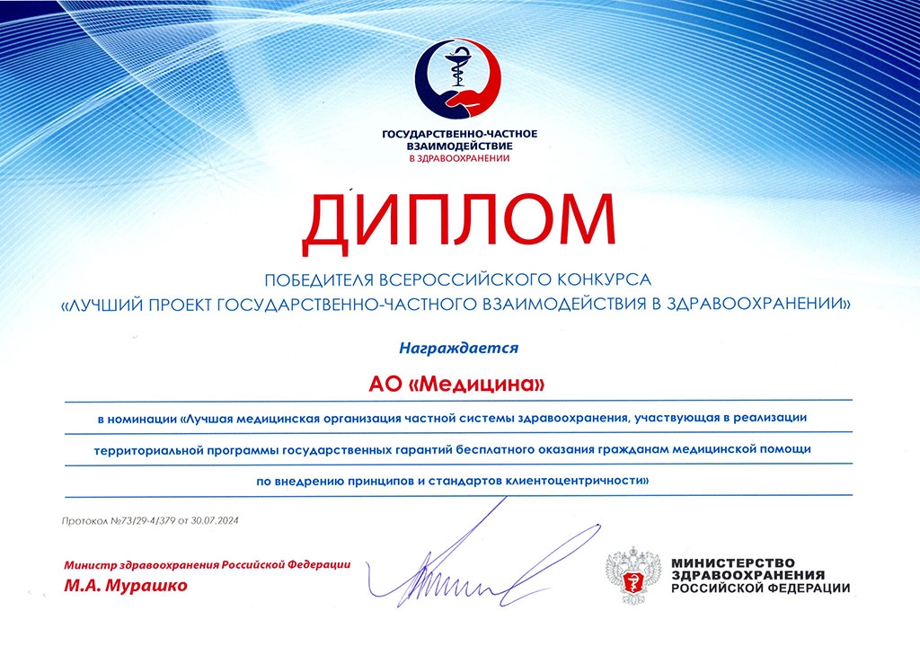 АО «Медицина» становится победителем всероссийского конкурса «Лучший проект государственно-частного взаимодействия в здравоохранении» в номинации «Лучшая медицинская организация частной системы здравоохранения, участвующая в реализации территориальной программы государственных гарантий бесплатного оказания гражданам медицинской помощи, по внедрению принципов и стандартов клиентоцентричности».