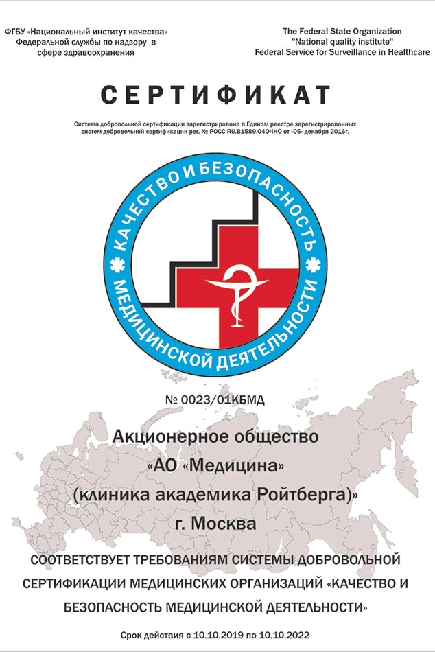 Клиника подтвердила соответствие стандартам ISO 9001:2015; ISO 15189:2012; ISO/IEC 27001:2013.
