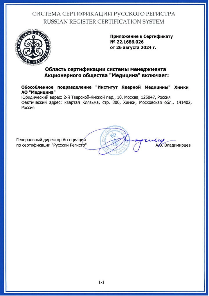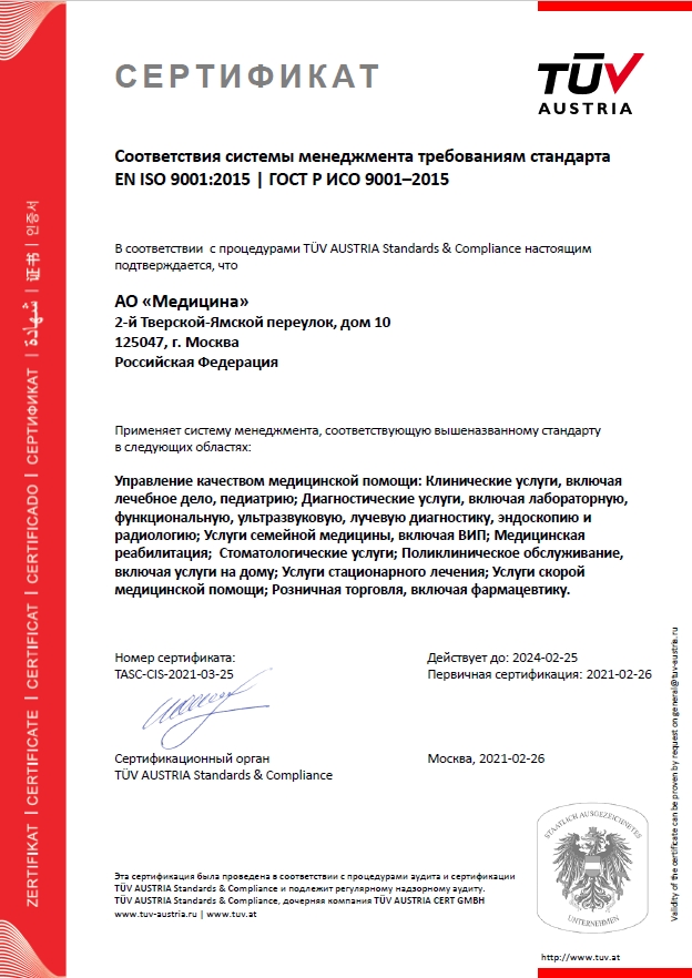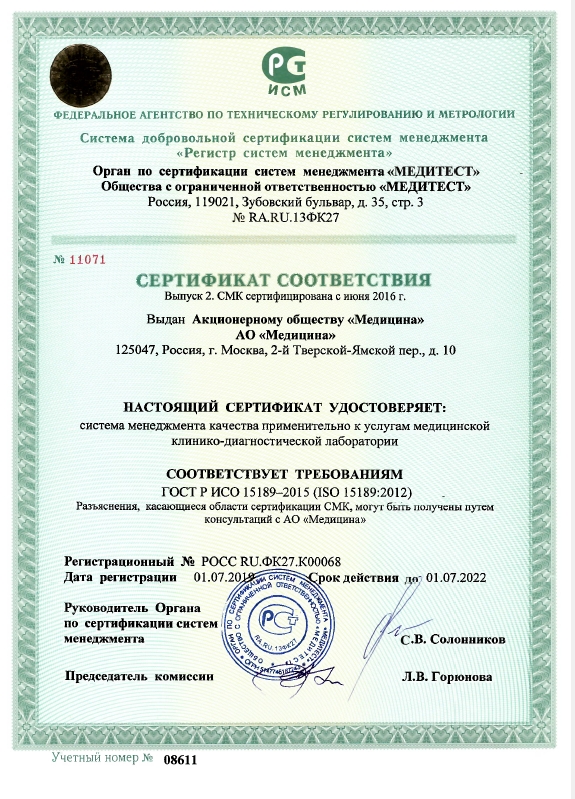 Акционерное общество «Медицина»(АО «Медицина») соответствует системе менеджмента качества применительно к услугам медицинской клинико-диагностической лаборатории и соответствует ГОСТу Р ИСО 15189-2024