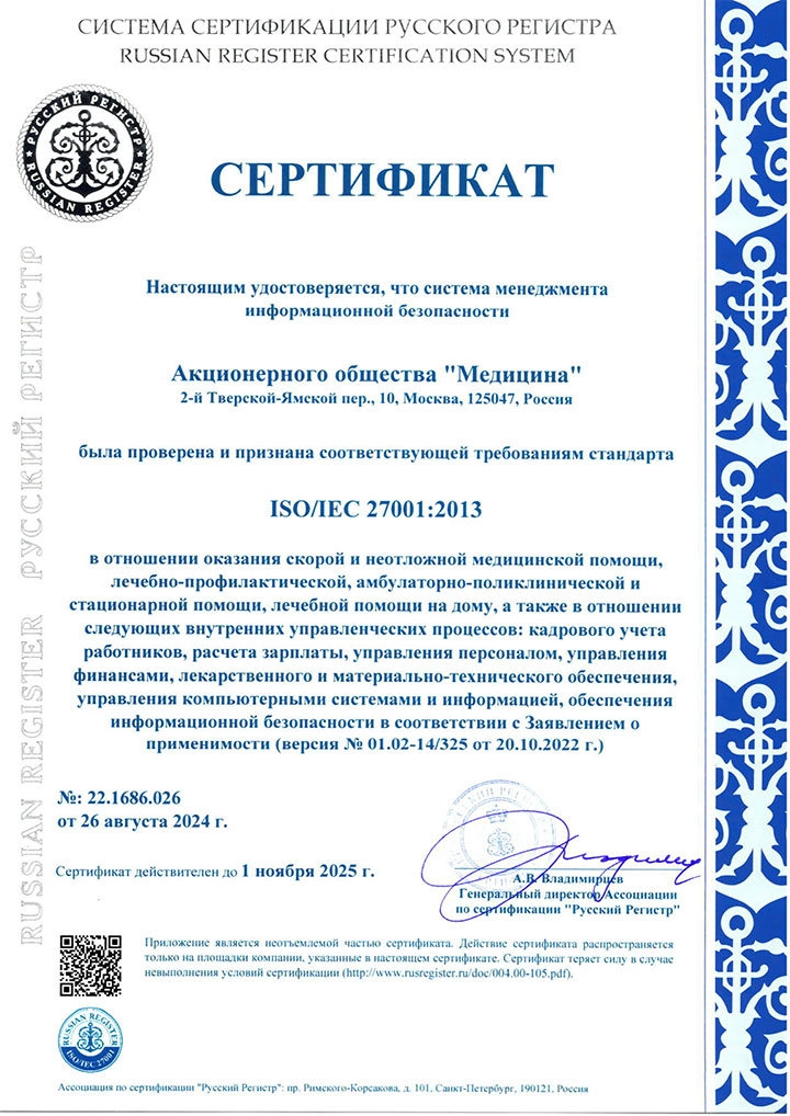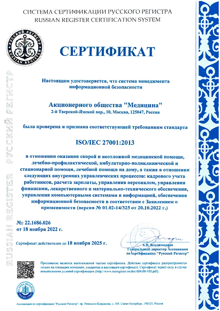 Наличие сертификата соответствия ISO 27001:2013 у АО "Медицина" (клиника академика Ройтберга) говорит о высоком уровне надежности за счет высокой степени защиты информации, хранящейся, обрабатываемой и передаваемой в рамках информационной системы, включая информацию о пациентах, заказчиках, партнерах и поставщиках.