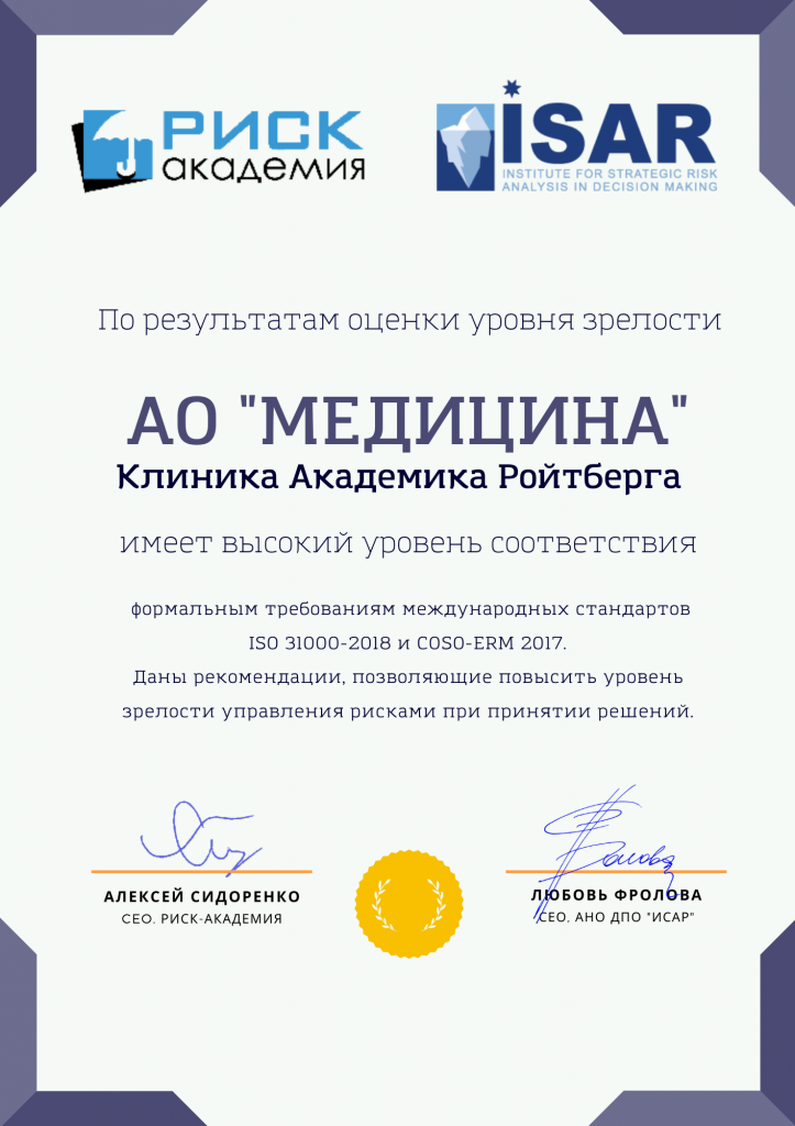 По результатам оценки РИСК  - Академии и АНО ДПО "ИСАР"  АО "Медицина" имеет высокий уровень соответствия требованиям международных стандартов ISO 31000-2018 и COSO-ERM 2017