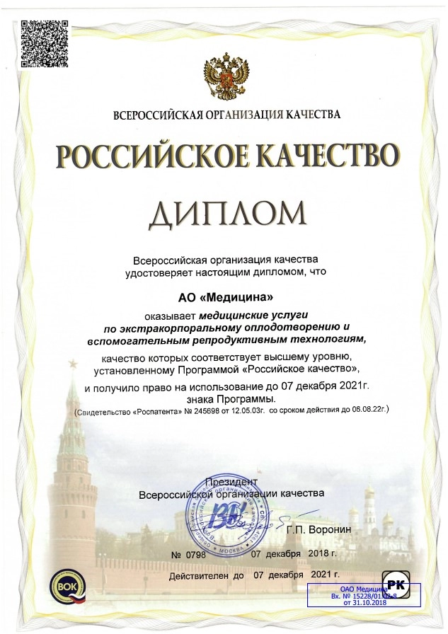 Качество медицинских услуг экстракорпоральному оплодотворению и вспомогательным репродуктивным технологиям в клинике АО "Медицина" соответствует высшему уровню, установленному программой "Российское качество" и удостоверено Дипломом Всероссийской организации качества.