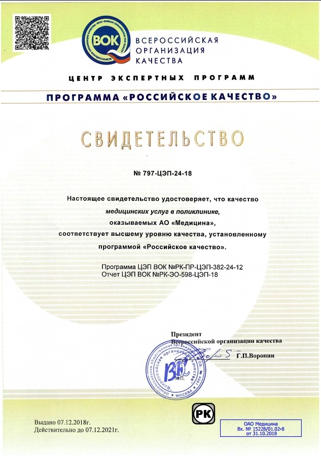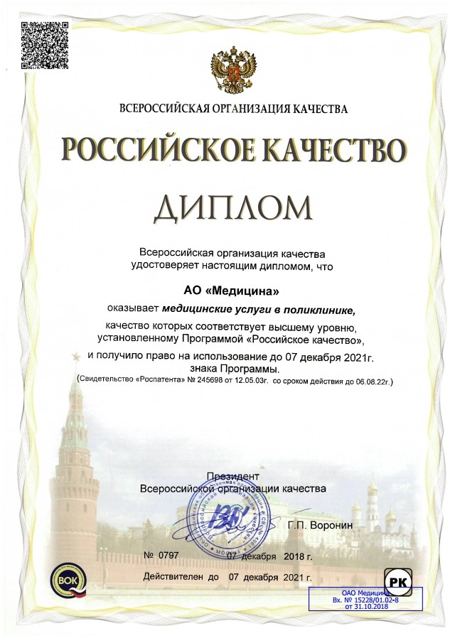 Качество медицинских услуг в поликлинике АО "Медицина" соответствует высшему уровню, установленному программой "Российское качество" и удостоверено Дипломом Всероссийской организации качества.
