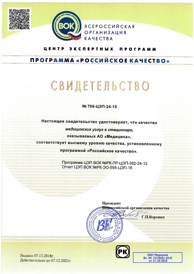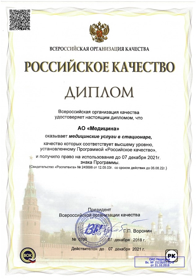 Качество медицинских услуг в стационаре клиники АО "Медицина" соответствует высшему уровню, установленному программой "Российское качество" и удостоверено Дипломом Всероссийской организации качества.
