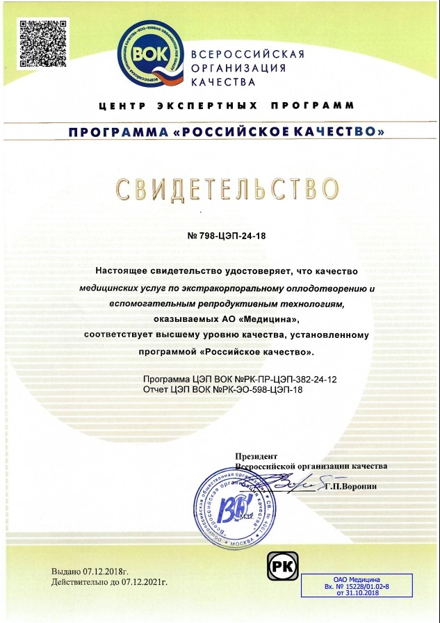 Качество медицинских услуг экстракорпоральному оплодотворению и вспомогательным репродуктивным технологиям, оказываемых в клинике АО "Медицина", соответствует высшему уровню, установленному программой "Российское качество".