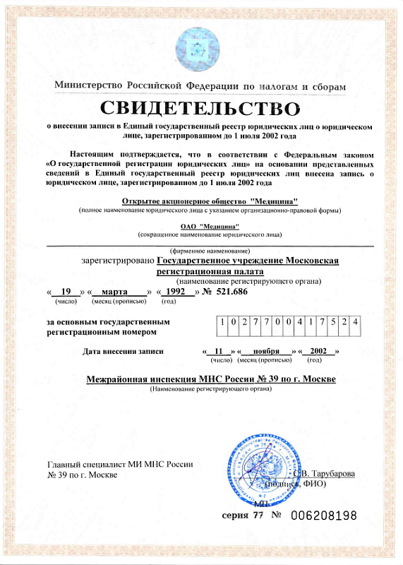 Cвидетельство о внесении записи в Единый государственный реестр юридических лиц о юридическом лице, зарегистрированном до 1 июля 2002 года
