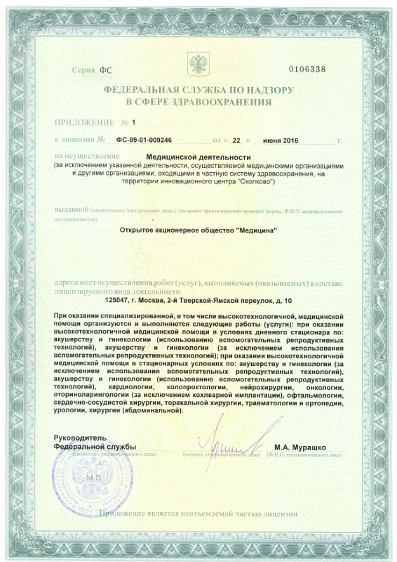 Лицензия №ФС-99-01-009637 от 17.04.2019 г. на осуществление высокотехнологичной медицинской помощи