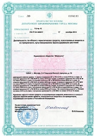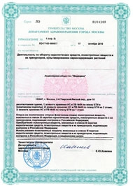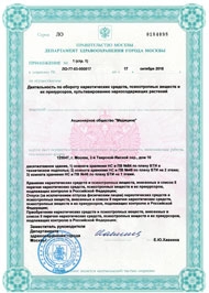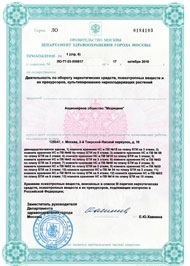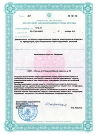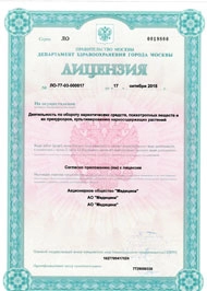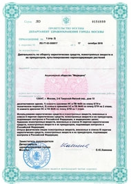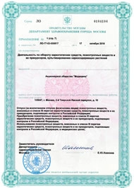 Лицензия № ЛО-77-03-000817 от 17.10.2018 г. на деятельность по обороту наркотических средств, психотропных веществ и их прекурсоров, культивированию наркосодержащих растений
