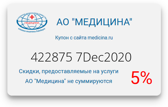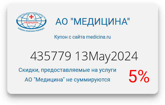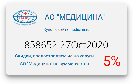 Разовая 5%-ная скидка на медицинские услуги поликлиники предоставляется при предъявлении распечатанного номерного купона администратору-кассиру клиники до получения услуги.