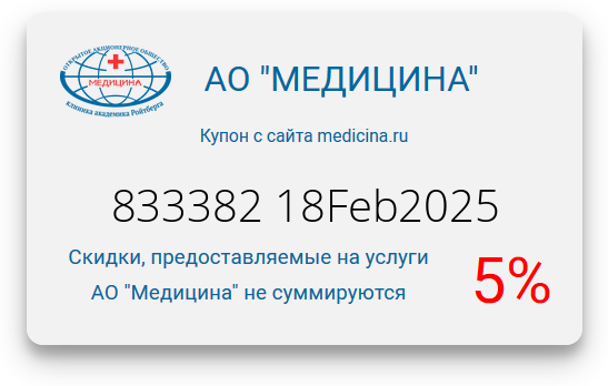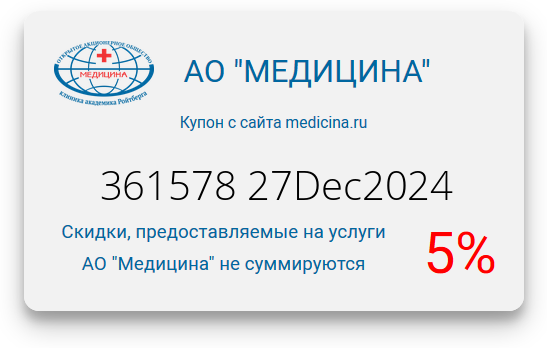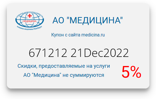 Скидки по единой дисконтной карте АО "Медицина" (клиника академика Ройтберга) и по дисконтному пропуску не суммируются.
