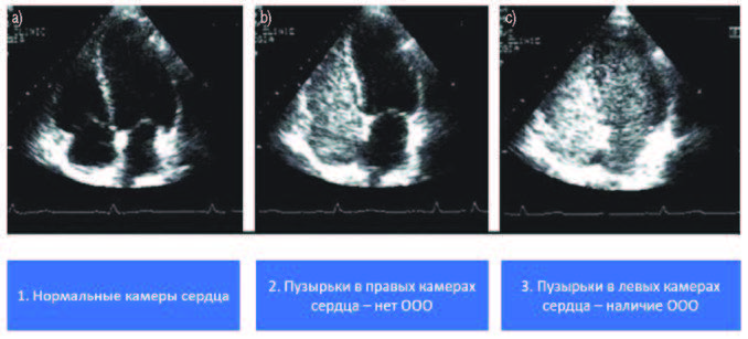 На ЭхоКГ, если нет отверстия между левым и правым предсердиями, пузырьки можно увидеть только в правом предсердие и правом желудочке, так как они будут отфильтрованы в легких и не попадают в левые отделы сердца.