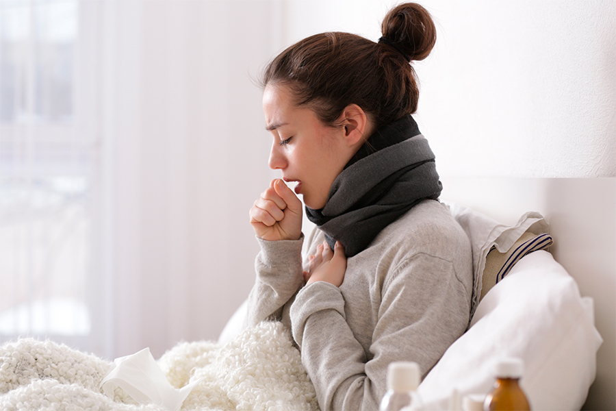 Признаки начальной стадии заболевания – заложенность носа, боль в горле, затрудненное дыхание. Постепенно инфекция и воспалительный процесс опускаются ниже по дыхательным путям, захватывая поверхность слизистой бронхов и трахеи. Пациенты жалуются на боль в области грудины, кашель, хрипоту, изменение тембра голоса, одышку. Появляется сухой приступообразный кашель, который у детей сопровождается тошнотой и рвотой. Через несколько дней кашель становится влажным с отделением мокроты, которая создает благоприятную среду для размножения бактерий. У некоторых пациентов отмечается незначительное повышение температуры тела, снижение аппетита, избыточная потливость.