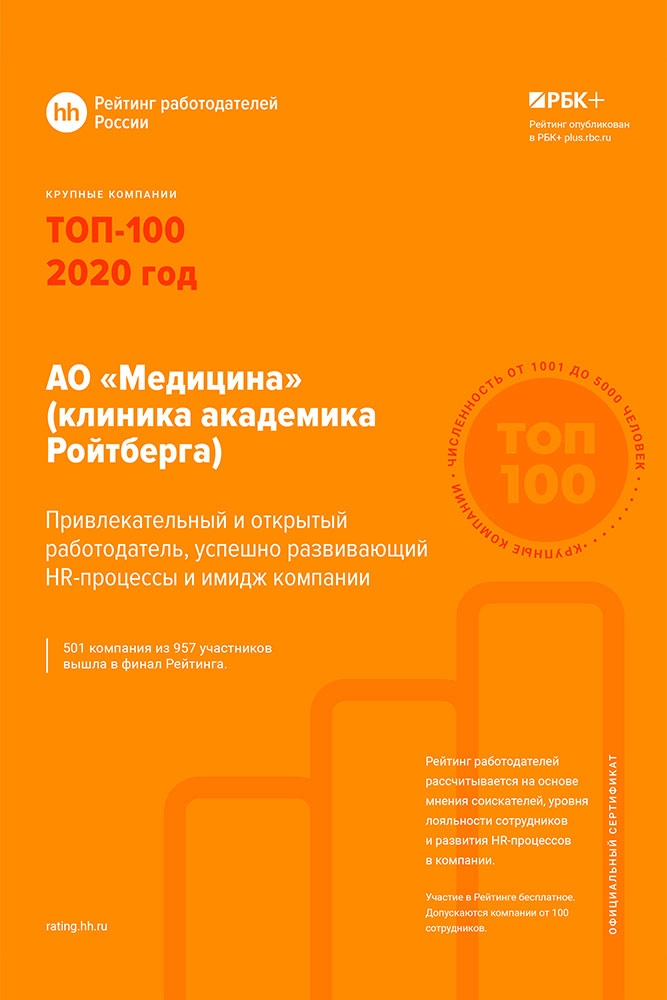 По результатам Рейтинга лучших работодателей России в 2020 году АО «Медицина» (клиника академика Ройтберга) вошло в ТОП-100 в номинации «Привлекательный и открытый работодатель, успешно развивающий HR-процессы и имидж компании».