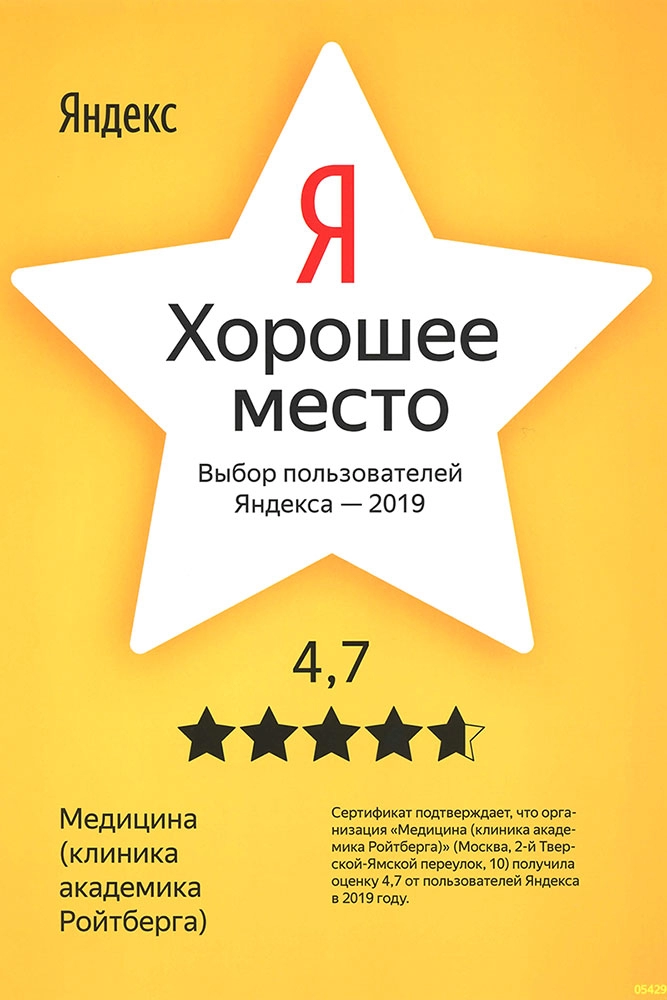 По итогам 2019 года АО «Медицина» (клиника академика Ройтберга) получило знак «Хорошее место» от пользователей Яндекса.
