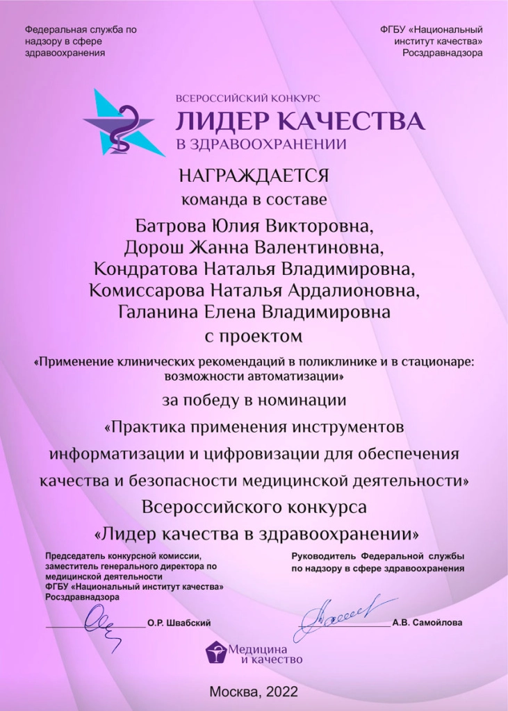 «В клинике академика Ройтберга ведется систематическая работа по обесп6ечению качества и безопасности медицинской помощи, - говорит директор медицинской службы АО «Медицина», к.м.н., доцент Жанна Дорош. - Медицинскую помощь пациентам мы оказываем на основе клинических рекомендаций* и данных доказательной медицины, что гарантирует ее высокое качество. Но интенсивность работы, следовательно - недостаток времени на изучение клинических рекомендаций, большой объем материала, необходимого для изучения, изменения, которые вносятся в клинические рекомендации, осложняют работу врача, из-за чего, врач может принять решение, которое не соответствует представлениям о качественном лечении. Поэтому нами был реализован проект по автоматизации процессов, связанных с применением клинических рекомендаций».