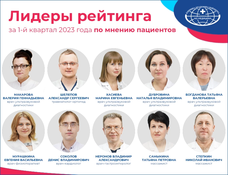 В конце каждого квартала мы подводим итоги рейтинга «Лучший специалист клиники АО «Медицина по результатам голосования пациентов». Предлагаем вашему вниманию список лидеров рейтинга по итогам 1 квартала 2023 года.