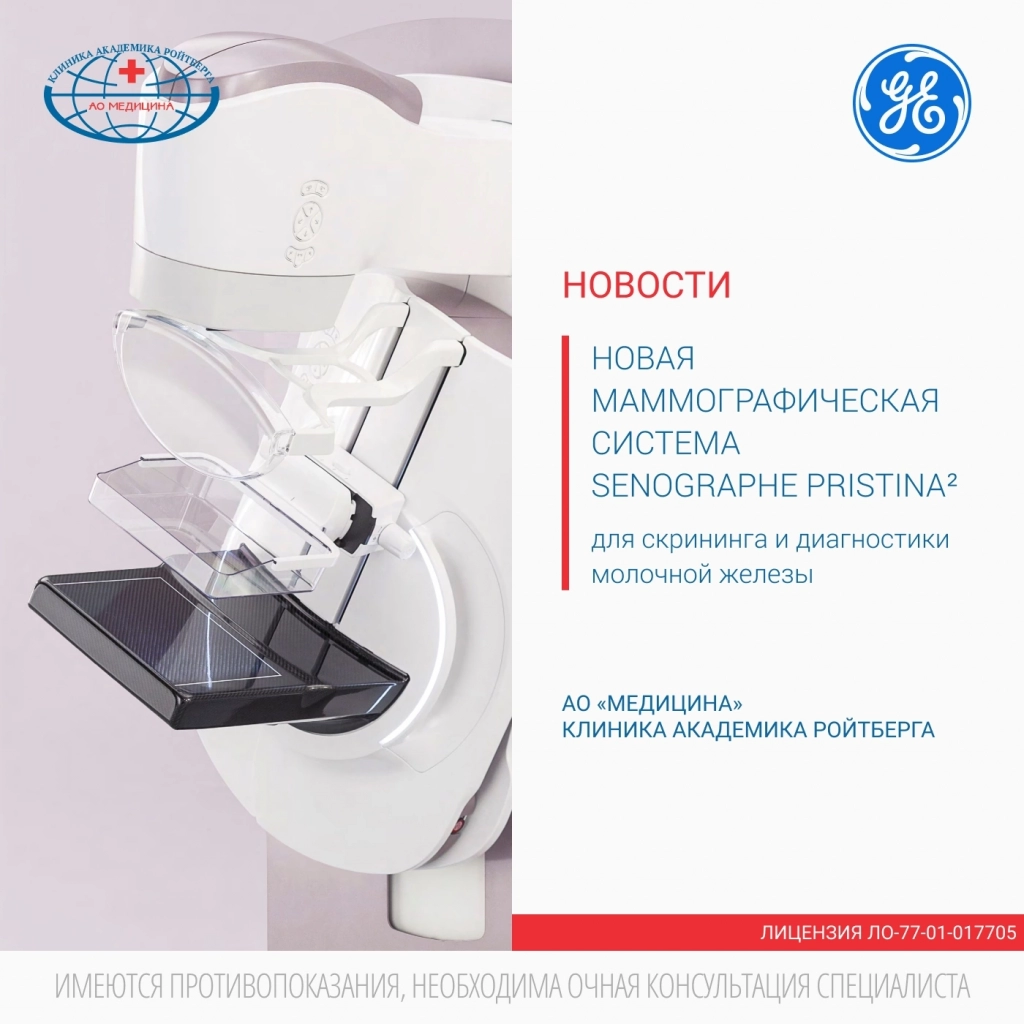 ВНИМАНИЕ: С 14.10.22 по 20.12.22, в связи с заменой оборудования, кабинет маммографии будет недоступен. В качестве альтернативы мы предлагаем: КТ, МРТ и сцинтиграфию молочных желез.