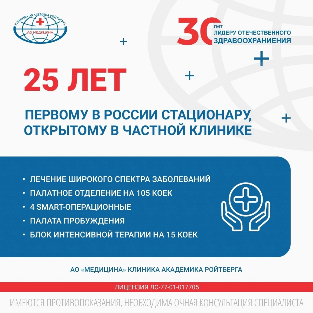 Москва, ноябрь 2021 – стационар АО «Медицина» (клиника академика Ройтберга) отмечает 25-летний юбилей. Это первый стационар в России, открытый в частной клинике.