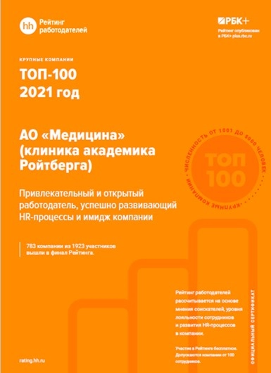 АО «Медицина» (клиника академика Ройтберга) вошло в ТОП-100 привлекательных работодателей России в 2021 году по версии Hh.ru. В рейтинге участвовали 1923 компании из всех областей бизнеса.